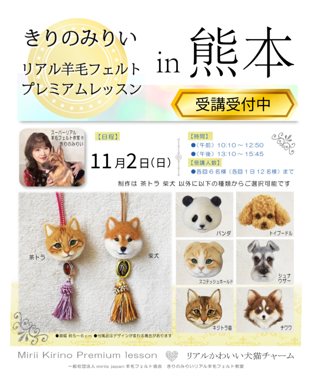 【受講募集!】熊本 11/2 きりのみりい プレミアムレッスン 羊毛フェルトのリアルかわいいチャーム制作